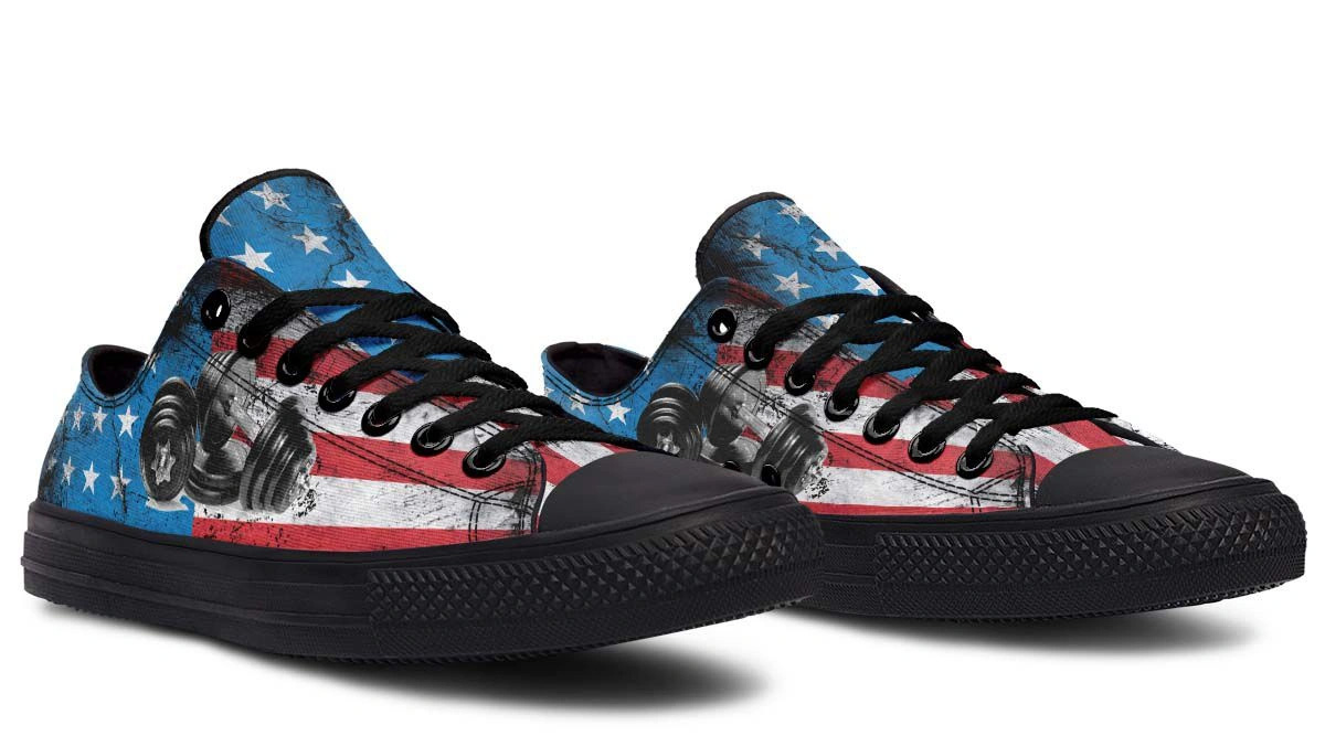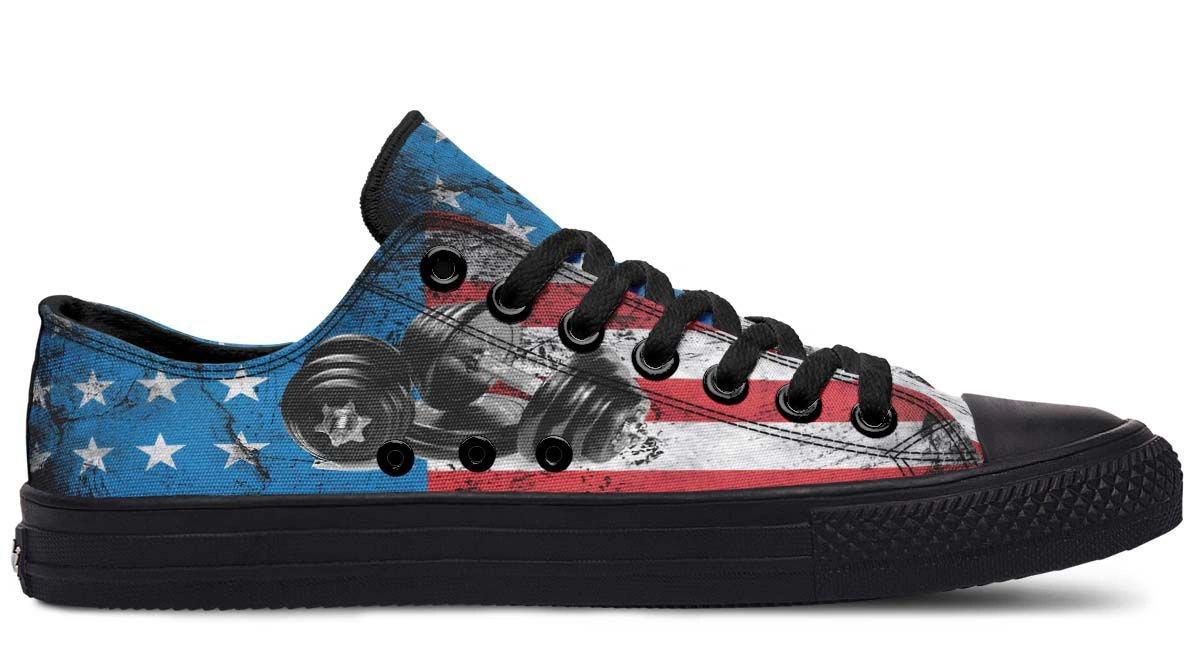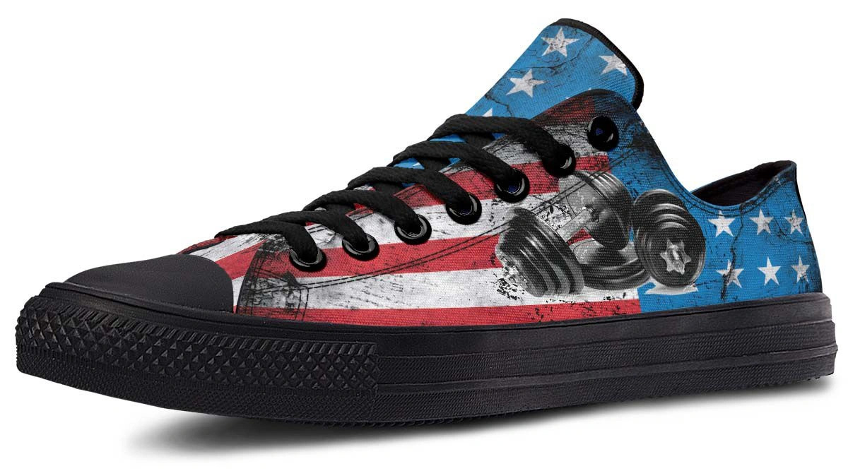 Step up your fitness and fashion game with the Dumbbell American Flag Black Lowtop Sneakers. These sneakers combine comfort and style, featuring a bold American flag design that showcases your patriotism. Ideal for workouts or casual outings, they offer superior support and durability. Whether you’re hitting the gym or the streets, these sneakers are a must-have for anyone who loves fitness and flair.