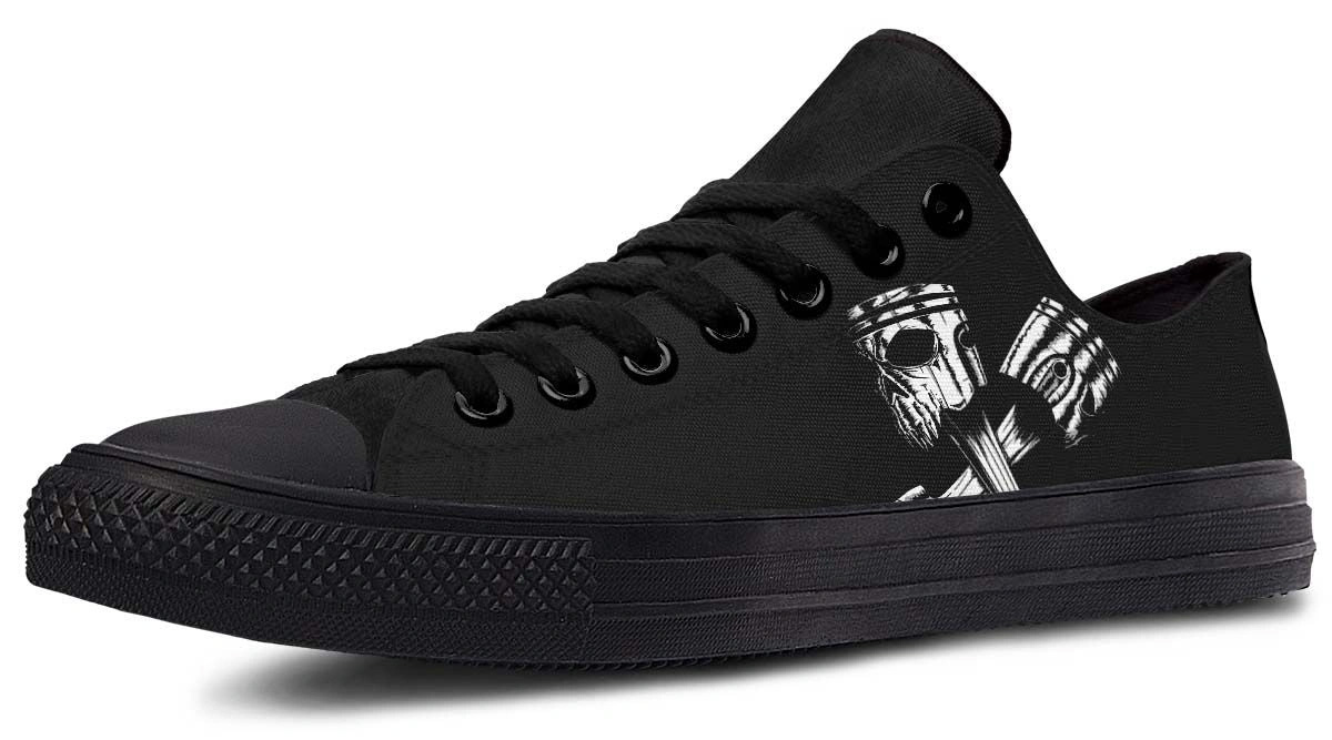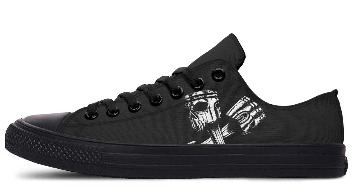 Elevate your footwear game with the Skull Engine Motor Black Lowtop Sneaker. Designed for those who crave a bold, edgy look, these sneakers combine sleek black styling with unmatched comfort. Ideal for casual outings or adding a rebellious touch to your ensemble, they feature durable construction and a lowtop design for all-day wear. Stand out with the Skull Engine Motor Sneaker your go-to for effortless style and att
